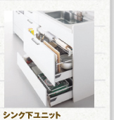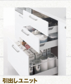 手前に包丁差し、まな板、調理器具を納める収納パーツ付き。 |